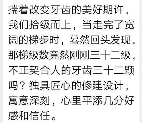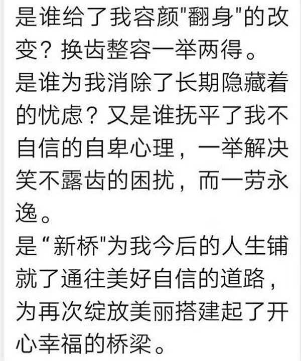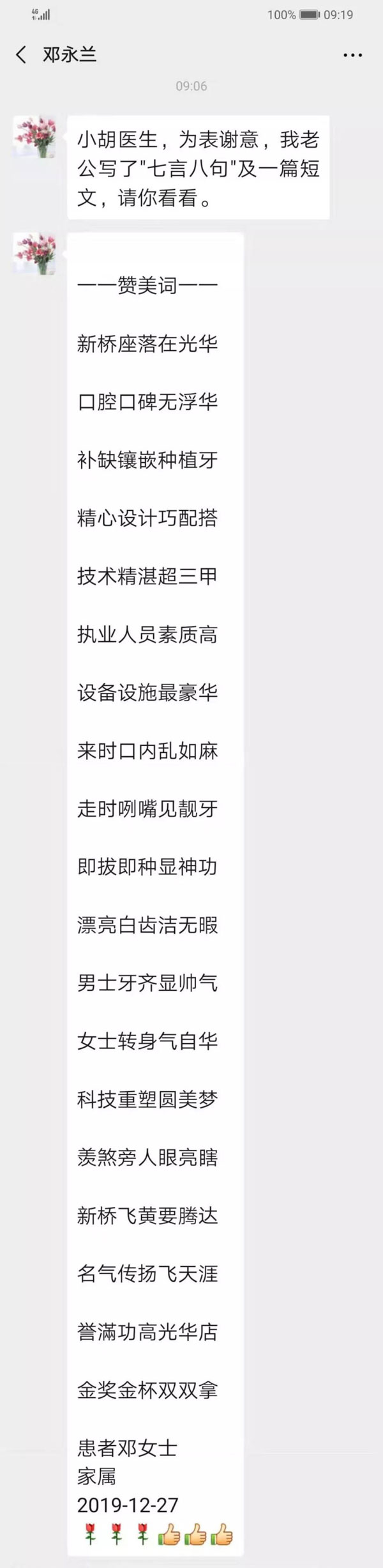 近日,新桥口腔光华店收到了顾客邓永兰女士发来的“特别”消息:一首工整的七言诗和一段充满喜悦之情的短文。