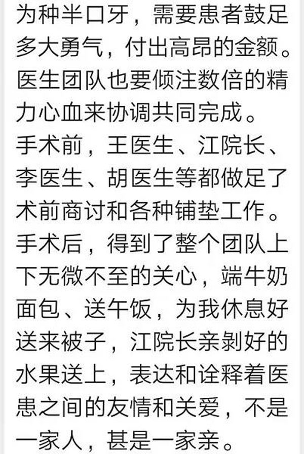 从上午九点到下午六点半,为了帮助邓女士种好牙,光华店医护团队十余人倾尽全力,一刻也不敢懈怠。在一旁陪伴爱人种牙的余先生见证了全部过程,感受到了他们的“心血”和“关心”,才会在手术结束后发自肺腑的感慨:不是一家人,甚是一家亲。