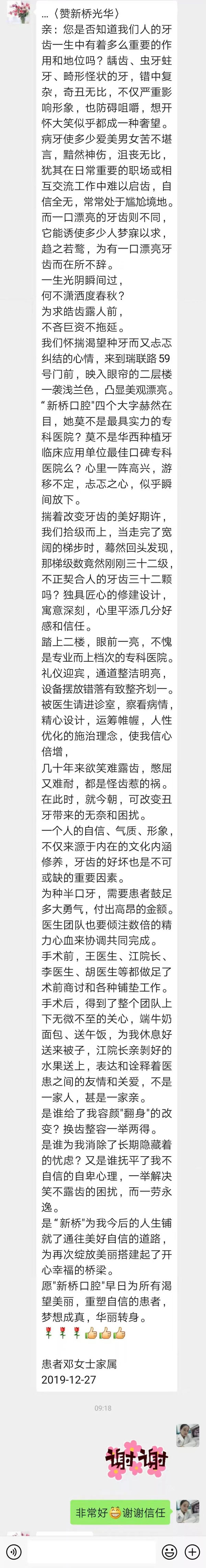 最后,我们还要向余先生和邓女士夫妇道一声诚挚的感谢,你们的信任和有爱的留言在这个冬天让所有新桥口腔工作人员心里很暖!在2020年即将到来之际,也祝所有缺牙顾客在新的一年里:上新桥种好牙,好口福更幸福!