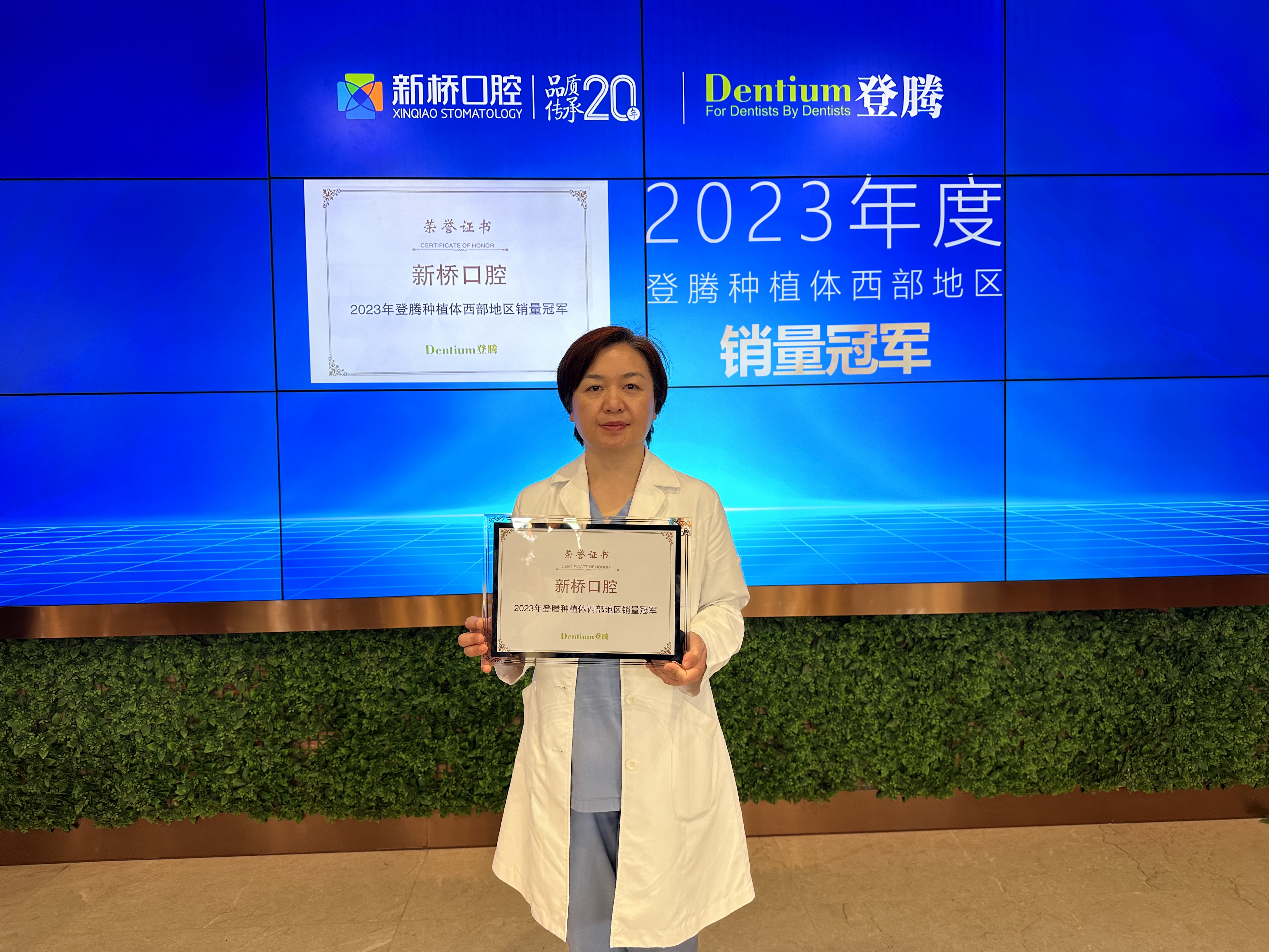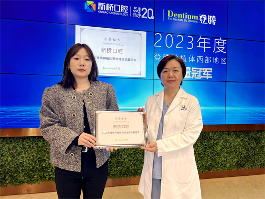 2024年3月15日,新桥口腔再获“2023年韩国登腾(DENTIUM)种植体西部地区销量冠军”、“韩国登腾(DENTIUM)种植牙金牌合作医疗机构”荣誉认证,全球知名王牌种植体品牌—韩国登腾为新桥口腔颁发奖牌。