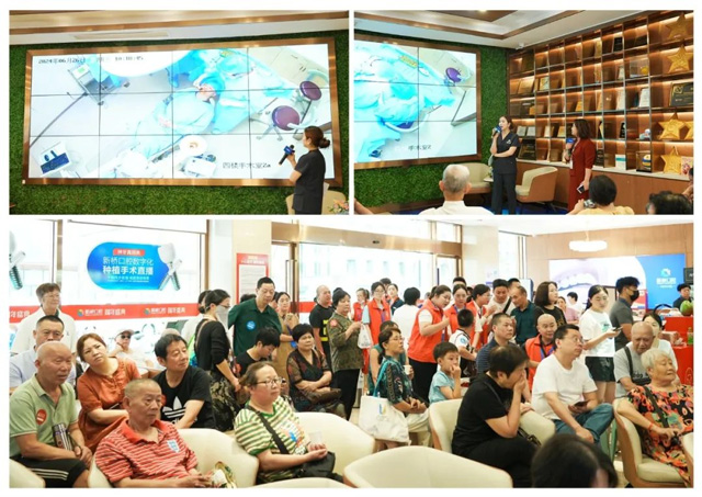 在观众专心致志听讲中,手术室已准备就绪。上午10点24分,直播大屏上开始实时转播易华波主任术中的每一个细节——从局部麻醉到创口预备,再到种植体精准植入,最后缝合创口,他用近30年口腔临床经验,为大家展示了一场高水平的“种牙真功夫”。
