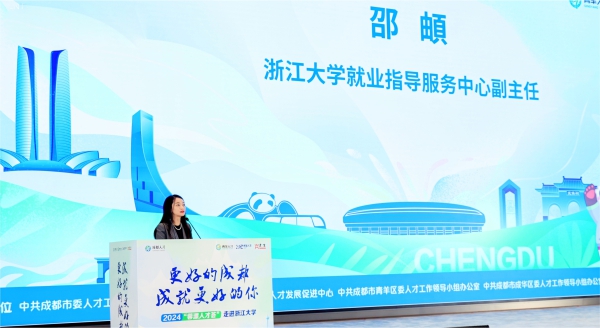 浙江大学就业指导服务中心副主任邵頔对来自成都市的众多企事业单位表示了欢迎,她介绍了浙江大学的悠久历史以及办学优势,并表示新时代的浙大学子将继续发扬先辈们求真务实的治学精神,为祖国建设发挥出自己的力量。