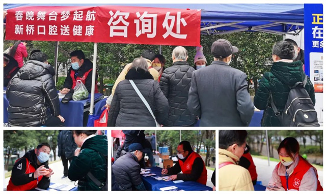 舞台旁,种牙口福工程便民服务点被居民团团围住,志愿者们热情地为居民们进行专业的口腔检查,耐心讲解口腔健康知识,并发放口腔护理用品。