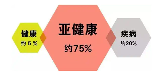 据世界卫生组织调查显示,人群中符合世界卫生组织健康标准者约占5%,患有各种疾病者约占20%,而处于亚健康状态的约占75%!亚健康人群要及时做好身心调理,预防疾病发生。