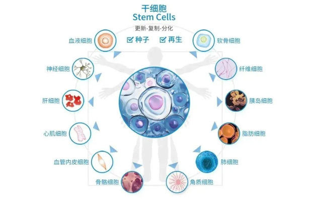 干细胞是人体所有细胞的起源细胞,干细胞所具有的修复再生能力可抑制系统性疾病转化的趋势,提高对心、脑组织细胞及全身组织细胞的代偿能力。干细胞具有自我更新复制、增殖能力和多向分化潜能,进入人体后会分化成人体所需的细胞从而对各系统衰老退化的组织细胞进行修复和更新。