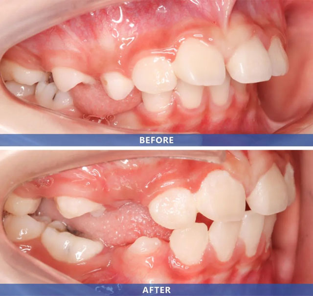关禹哲医生:彤彤换牙偏晚偏慢,门牙牙根还没发育好,如果做矫形,治疗周期会很长,加力不合适会影响到牙根发育;从她的年龄和口颌系统发育阶段来看,今后做功能矫形的时间还很充裕。所以,对她来说当下就佩戴功能矫治器不是必须的,且弊大于利。彤彤正处于下颌骨发育高峰期,经过半年的肌功能训练,深覆盖、深覆合和下巴后缩都得到了明显改善,达到了治疗目的。当然,彤彤的情况只是个例。