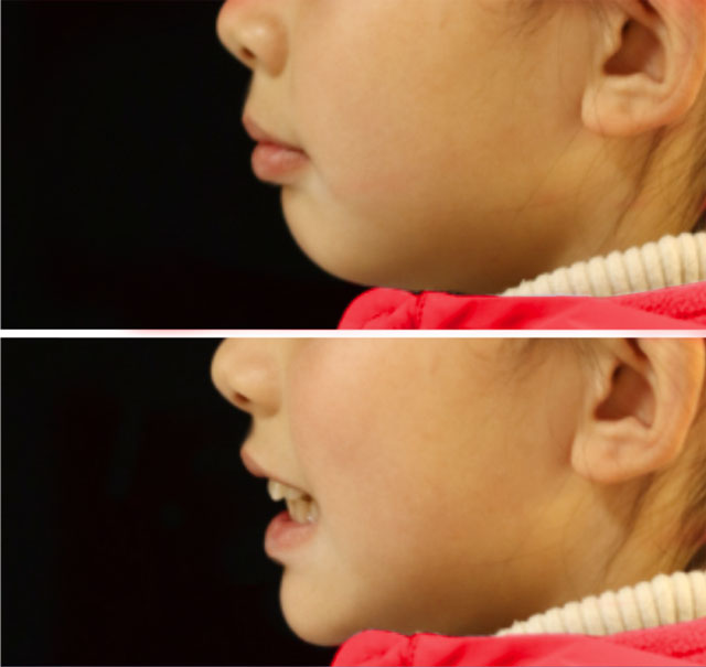 四岁时,妈妈就发现彤彤有口呼吸的习惯,去三甲医院确诊了腺样体肥大,医生说处于临界值不建议手术,每年复诊观察即可。一晃到了小学,妈妈发现七岁的彤彤脸型没以前好看了,下巴越来越小。“下巴一点都不明显,好像没发育一样。”妈妈从手机里翻出她幼儿园的毕业照,照片上的小姑娘有着一张圆润可爱的鹅蛋脸。