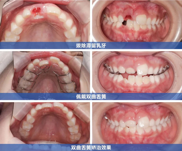 考虑到朵朵的乳牙没有明显松动,且萌出的门牙恒牙位置异常,孙叡医生决定拔除滞留乳牙,并通过佩戴双曲舌簧将恒牙引导到正常位置,避免产生更严重的牙列畸形。