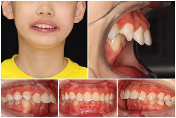 上牙前突、下颌后缩,重度深覆合深覆盖,更棘手的是后牙锁颌严重影响了他的生活质量。“上下后牙咬不到一起,两边大牙没有对齐,连个面条都咬不断。”妈妈回忆道:“还总是张着嘴,睡觉也闭不上,看着都揪心。”