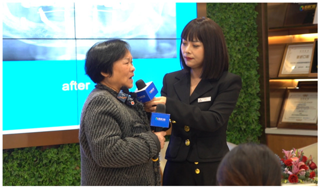 当现场观众还沉浸于王旭东主任一气呵成的操作中时,他已向直播镜头挥手示意宣布手术完成,仅用9分钟便为胡女士实现了缺牙重生。随后,王旭东主任医生和胡女士在热烈的掌声中来到观众们面前。 面对比自己年长许多,却和自己“同病相怜”的观众们,胡女士丝毫不吝分享自己的种牙体验:“除了刚开始打麻药时有一点针刺感,整个手术过程中我都没有感受到任何疼痛和不适,王旭东医生速度很快几分钟就结束了,我个人非常满意!”