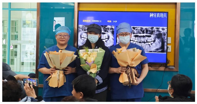 仅8分钟,手术圆满完成。王旭东主任无比精湛、流畅的“种牙真功夫”,赢得了大家一致好评。在热烈的掌声与叫好声中,王旭东主任与周女士重返直播现场。