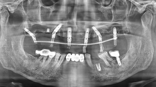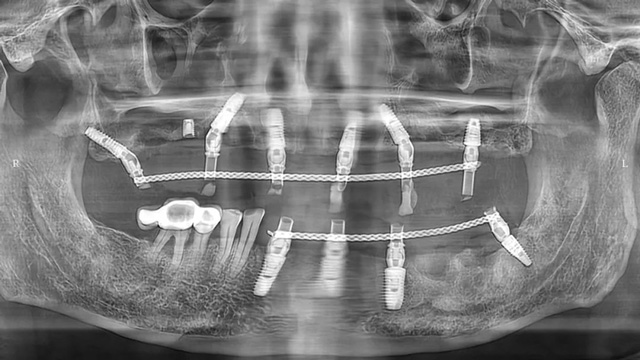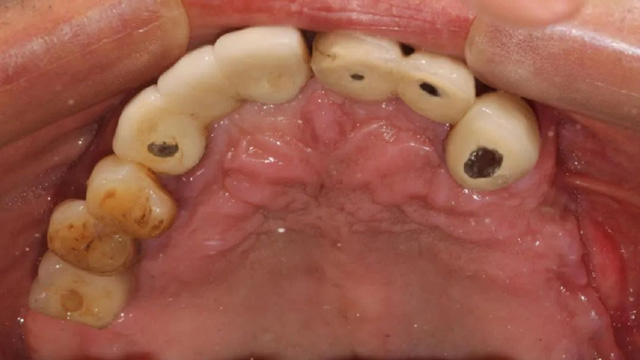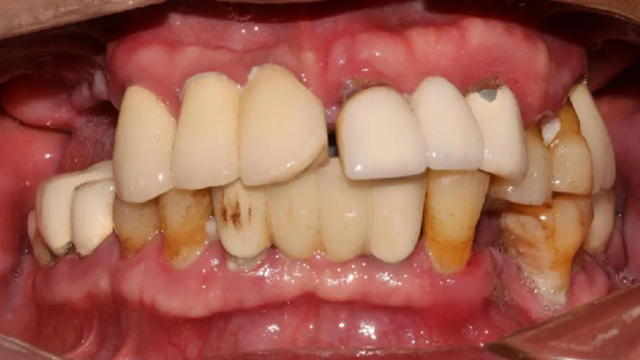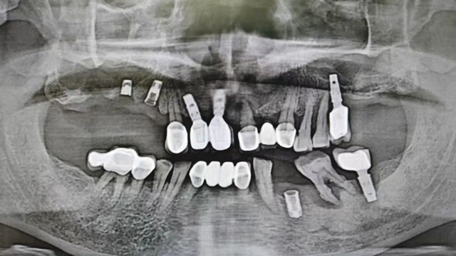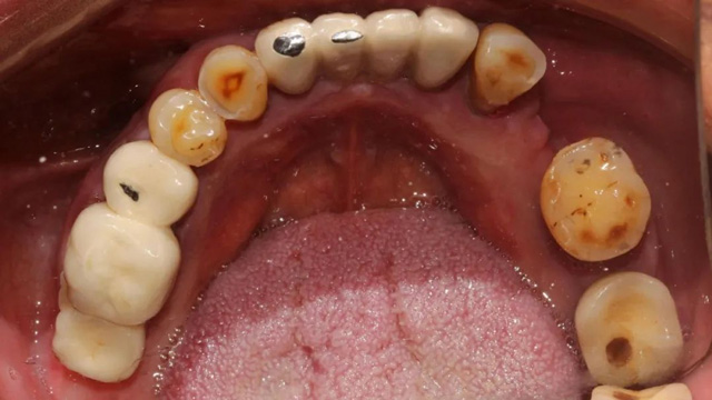 “上面种了4颗,断了两颗,脱落1颗,只有1颗能用,下面有一颗牙冠脱落,另一颗有种植体周围炎,有明显的骨吸收。”吴叔叔剩下的天然牙也不好,做了几处修复,之前的牙冠修复用的都是烤瓷牙,有好几颗磨损严重露出了金属。由于存在缺牙、不良修复体等情况,口腔整体咬合紊乱,进食很困难。