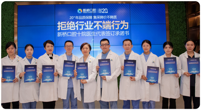 2023年,新桥口腔各院区医生代表签署《高品质集采种牙承诺书》,从材料品质、医生实力、服务水平、远期效果四个层面,保障集采种牙降价不降质,为种植行业正向发展树立标杆。