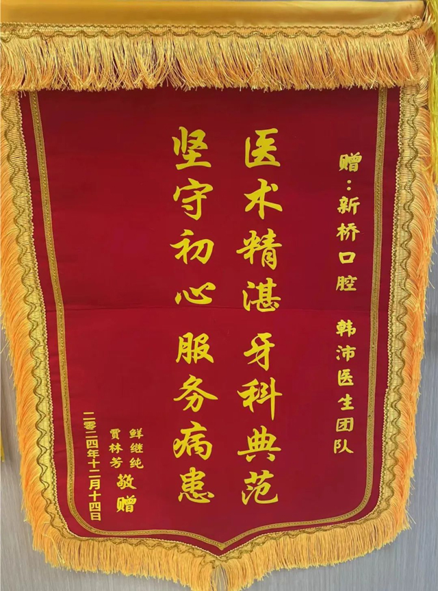 还有一对老两口,在韩沛这里做常规种植牙。种植过程中,老两口几乎没感觉到疼痛。“就跟自己原来的牙一样,现在吃饭都不恼火了,美得很。”修复后效果绝佳,为表感激,老两口特意送来了锦旗,上面写满了对韩沛的赞誉。