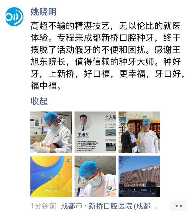 2025年3月13日,年逾60岁的姚晓明教授在新桥口腔成功完成了第四次种牙治疗。一如既往的高品质服务,让他忍不住在朋友圈赞叹:“高超不输的精湛技艺,无以伦比的就医体验。”与此同时,他还分享了自己与新桥口腔之间的深厚缘分。