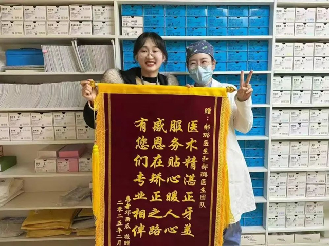 近日,在新桥口腔成都衣冠庙院区上演了暖心一幕:刚刚结束正畸矫治的邓女士,满怀感激地将定制锦旗送到了正畸医生郝璐手中。