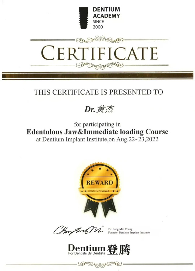 2022年,黄杰获得登腾无牙颌种植培训班证书