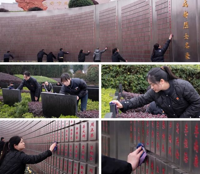在纪念碑后方,是镌刻着烈士姓名的《成都烈士名录》纪念墙。大家用毛巾仔细擦拭着烈士姓名,并自发走进烈士墓区,通过擦拭墓碑、清理枯枝杂草、瞻仰烈士生平事迹的方式,向革命英烈们表达崇高敬意和无限哀思。