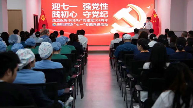 为庆祝中国共产党成立104周年,深入学习贯彻党的二十大精神,进一步强化党员干部党性修养、厚植员工爱国爱党情怀,6月10日,新桥口腔“迎七一 强党性 践初心 守党纪”专题党课活动在新桥口腔成都总院(成都人南新桥口腔医院)成功举办。