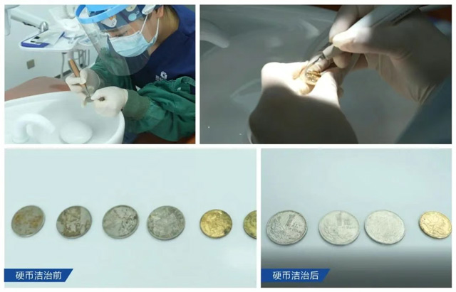 8月13日上午,考验参赛选手实操的首战——“旧币清洗”环节拉开帷幕,选手们需使用洁牙器械对布满顽固污渍的旧硬币进行深度清洁。此环节不仅考验器械操控的稳定性,更模拟了在临床中对牙结石、色素沉积的精细处理能力。