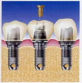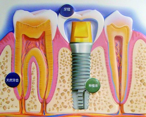 在种植体种入牙槽骨3-6个月后,依靠体内骨细胞的生长,使种植体与牙槽骨牢固生长结合在一起,然后再在种植体上进行烤瓷牙修复,从而达到牙齿修复的目的。